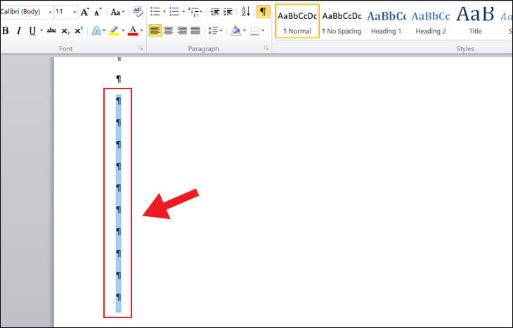 Bước 3: Khi các ký tự ¶ xuất hiện, tô chọn toàn bộ các ký tự này và nhấn Delete để xóa trang trắng.