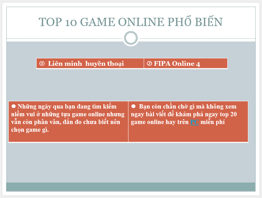 Slide 2: Nhập nội dung và Design lại Themes theo kiểu Civic. Tạo hiệu ứng Emphasis cho các đối tượng trên Slide kiểu Lighten. Tạo hiệu ứng chuyển tiếp Slide theo kiểu Cover.